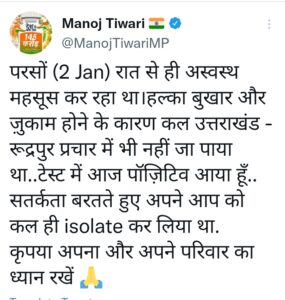 तो वहीं दिल्ली भाजपा सांसद व पूर्व प्रदेश अध्यक्ष मनोज तिवारी ने भी अपने ट्वीटर के ज़रिए इस बात का खुलासा करते हुए लिखा है परसों (2 Jan) रात से ही अस्वस्थ महसूस कर रहा था।हल्का बुखार और ज़ुकाम होने के कारण कल उत्तराखंड – रूद्रपुर प्रचार में भी नहीं जा पाया था..टेस्ट में आज पॉज़िटिव आया हूँ। सतर्कता बरतते हुए अपने आप को कल ही आइसोलेट कर लिया था। कृपया अपना और अपने परिवार का ध्यान रखें।