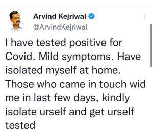 दिल्ली के मुख्यमंत्री अरविंद केजरीवाल ने ट्वीट के ज़रिए इस बात का खुलासा करते हुए लिखा कि मैं टेस्ट में पॉजिटिव पाया गया हूँ।माइल्ड सिम्पटम्स है।मैन खुद को घर में ही आइसोलेट कर लिया है।जो लोग इन दिनों मेरे संपर्क में आये थे वे कृप्या खुद को अलग कर अपना तुरंत टेस्ट करवा लें।