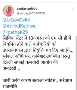 एमसीडी की कार्यशैली से दिल्ली सफाई कर्मचारी आयोग के चेयरमैन संजय गहलोत खफ़ा, ट्वीट कर दर्ज कराई अपनी नाराज़गी..