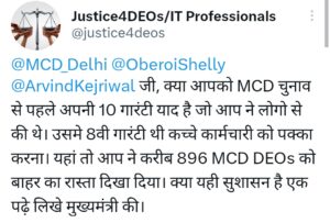 @MCD_Delhi@OberoiShelly @ArvindKejriwal जी, क्या आपको MCD चुनाव से पहले अपनी 10 गारंटी याद है जो आप ने लोगो से की थे। उसमे 8वी गारंटी थी कच्चे कार्मचारी को पक्का करना। यहां तो आप ने करीब 896 MCD DEOs को बाहर का रास्ता दिखा दिया। क्या यही सुशासन है एक पढ़े लिखे मुख्यमंत्री की।