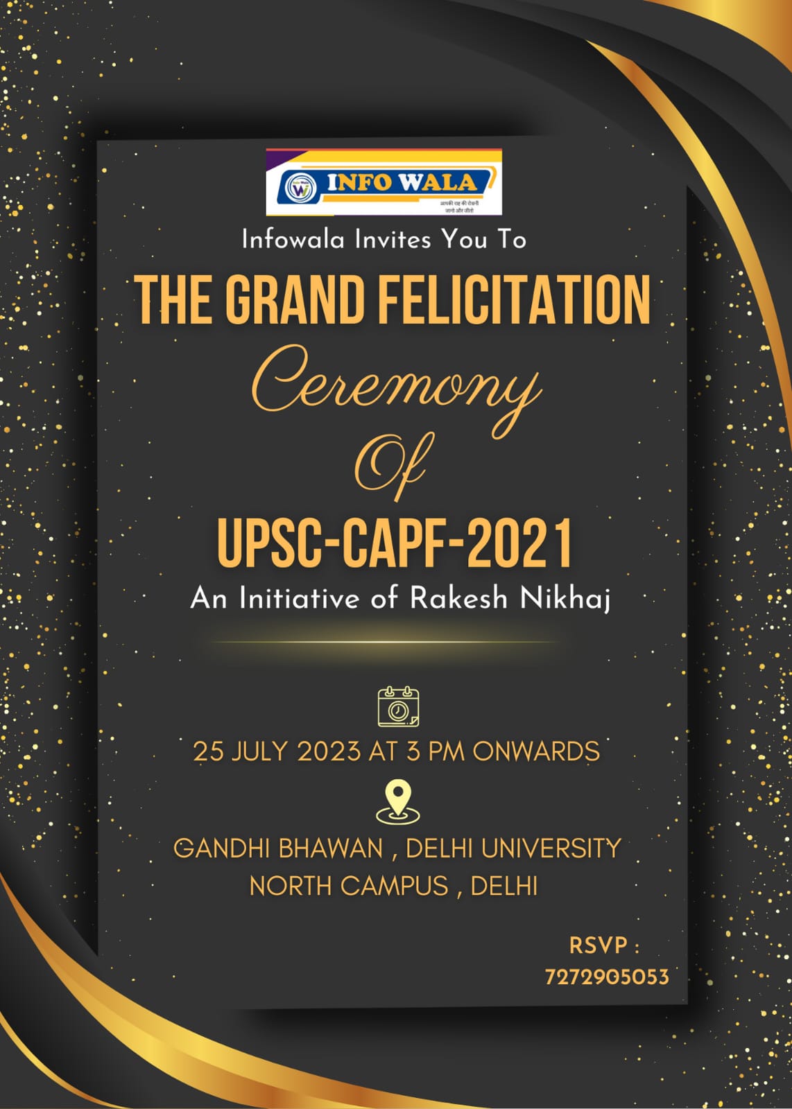 देश के लिए जान की बाजी लगाने वाले सैनिकों के साथ कंधे से कंधा मिलाकर हर मोर्चे पर उनका साथ देने में पैरामिलिट्री फोर्स भी अभूतपूर्व भूमिका में है। असिस्टेंट कमांडेंट पद पर चयनित टॉपरों के सम्मान में दिल्ली विश्वविद्यालय के गांधी भवन में कारगिल विजय दिवस के पूर्व संध्या पर कार्यक्रम का आयोजन होगा। मंगलवार (25जुलाई) को आयोजित होने वाले कार्यक्रम में यूपीएससी-सीएपीएफ 2021 (सेंट्रल आर्म्ड पुलिस फोर्स ) परीक्षा में चयनित टॉपर एक छत के नीचे जुटेंगे और सफलता के मंत्र को छात्रों के बीच सांझा करेंगे।