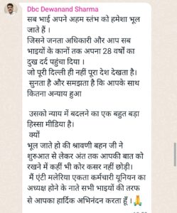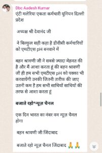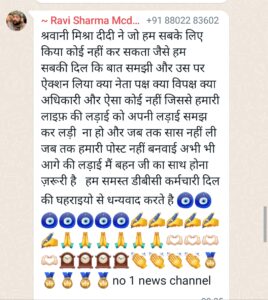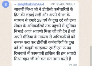 वहीं हाकिम सिंह ने लिखा है कि श्रावणी मिश्रा जी ने डीबीसी कर्मचारियों को हित की लड़ाई लड़ी और अपने चैनल के माध्यम से हमारे 28 वर्ष के दुख दर्द को उच्च लेवल के अधिकारी तक पहुंचने में अहम भूमिका निभाई है आज श्रावणी मिश्रा की देन है जो अपने मीडिया के माध्यम से अधिकारियों को रूबरू करा कर डीबीसी कर्मचारियों के दुख दर्द को बखूबी समझकर एमटीएस पद दिलवाने में कामयाबी हासिल की जिसके लिए हम उनका नमन करते हैं