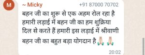 मिक्की ने लिखा है की बहन जी का शुरू से ही अहम रोल रहा है हमारी लड़ाई में। हम बहन जी का शुक्रिया दिल से करते हैं। हमारी इस लड़ाई में श्रावणी बहन का बहुत बड़ा योगदान है।