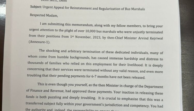 नेता प्रतिपक्ष ने कहा कि डीटीसी के 10 हजार बस मार्शलों को पिछले साल 11 अक्टूबर 2023 में तत्कालीन मुख्यमंत्री अरविंद केजरीवाल के निर्देश पर नौकरी से बिना कारण बताए हटा दिया गया था और सबसे चिंताजनक बात यह है कि उन्हें नौकरी से हटाने से पहले 5-6 महीने तक वेतन ही नहीं दिया गया जो कि अभी 1 साल बीतने के बावजूद भी पेंडिंग है, जिस कारण इन मार्शलों का परिवार भारी आर्थिक तंगी से जूझ रहा है।
