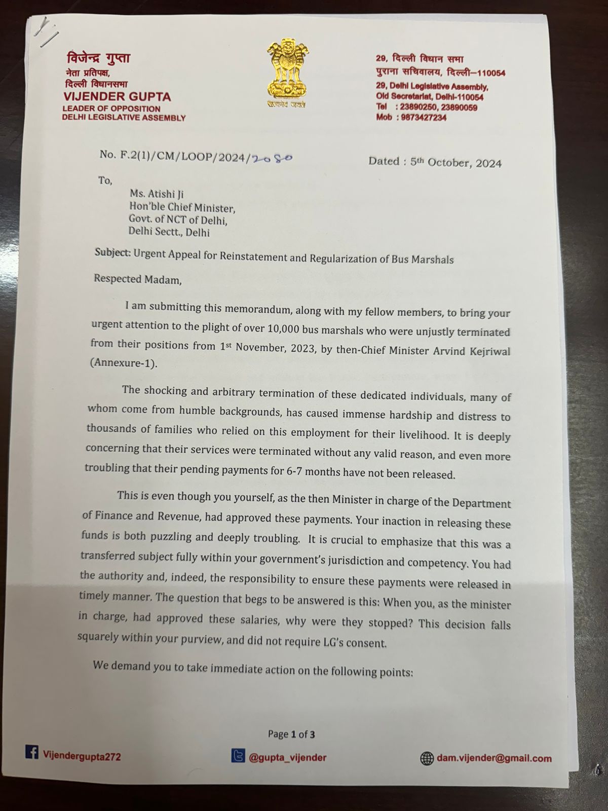 दिल्ली विधानसभा में नेता प्रतिपक्ष विजेंद्र गुप्ता के नेतृत्व में भाजपा विधायक दल ने आज मुख्यमंत्री आतिशी से मिलकर दिल्ली के उन 10 हजार बस मार्शलों को, जिन्हें केजरीवाल के आदेश पर पिछले साल नौकरी से बर्खास्त कर दिया गया था, नौकरी पर पुनः बहाल करने और उन्हें नियमित करने के लिए एक ज्ञापन सौंपा। ज्ञापन में विजेंद्र गुप्ता ने दिल्ली सरकार से अनुरोध किया है कि वह उनके द्वारा विधानसभा में इस संबंध में पेश किए गए प्रस्ताव पर विचार करते हुए कैबिनेट नोट तैयार करें और कैबिनेट से इसकी मंजूरी लेकर इसे फाइनल अप्रूवल के लिए उपराज्यपाल को भेजें।