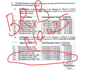 भारत सरकार ने एक आर्डर जारी करते हुए सात अधिकारियों के दिल्ली नगर निगम में कार्यकाल खत्म होने का जिक्र किया है। उन सात अधिकारियों में एक नाम अश्विनी कुमार का भी है। हालांकि यह भी जानकारी दी जा रही है कि यह नाम जरूर अश्विनी कुमार से जुड़ा है लेकिन यह निगम आयुक्त नहीं बल्कि कोई और अश्विनी कुमार हैं।